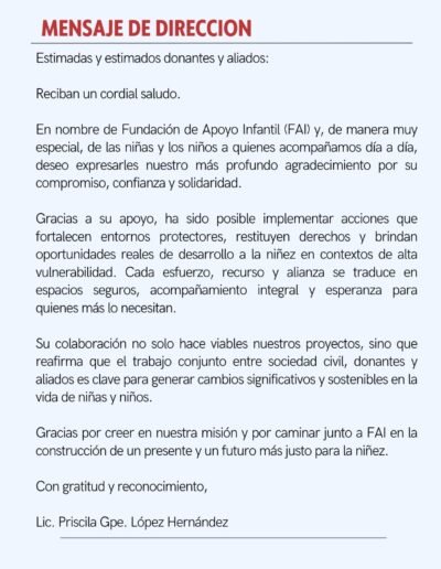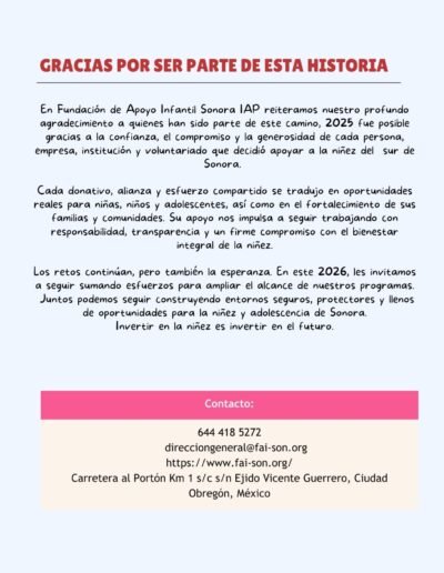 Gracias a donantes, aliados, voluntariado y comunidad por hacer posible que m谩s ni帽as y ni帽os tengan oportunidades, protecci贸n y un futuro con dignidad.